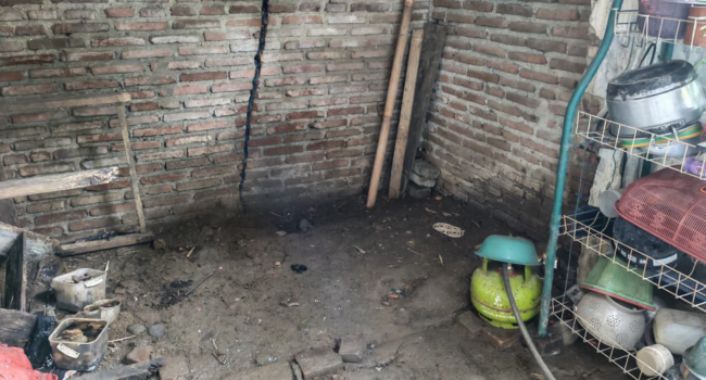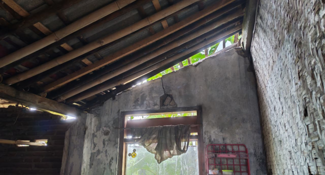 Rumah yang dihuni Ibu Maryam bersama suami dan dua anaknya berada dalam kondisi kurang layak. Atap telah kropos dan sering bocor saat hujan turun. Beberapa bagian struktur bangunan tampak rapuh dan membutuhkan perbaikan. Lantai rumah sebagian berlubang, sementara area dapur dan kamar mandi masih berupa tanah. Kondisi tersebut berpotensi membahayakan keselamatan serta berdampak pada kesehatan keluarga.